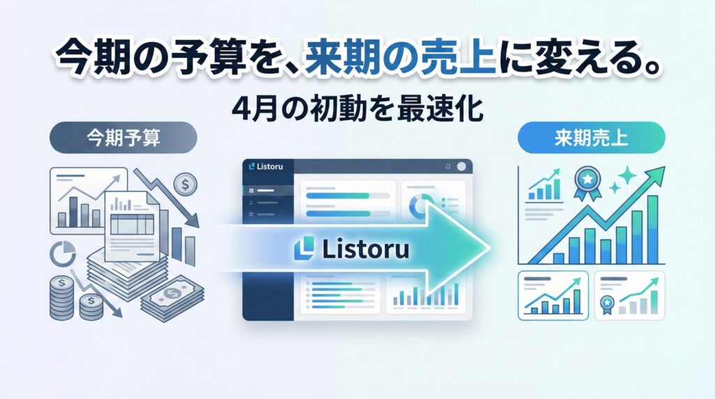 Listoruは、来期の営業を最短で動かすために必要な “リスト” と “実行できる状態” を、年度末の今期予算でまとめて用意できるサービスです。