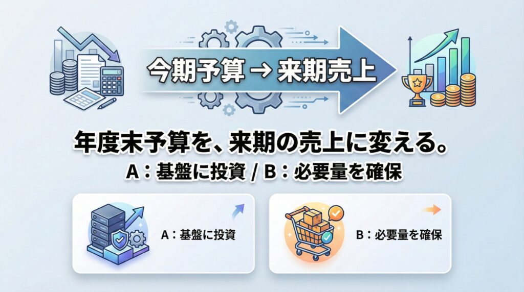 余った予算を税金で持っていかれるくらいなら、来年の 「売上の種(リスト)」と「武器(運用の型)」 に変えませんか?