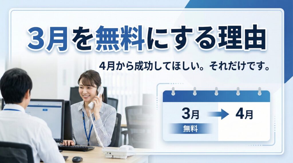 4月からのお申込みをいただくだけで、3月中のシステム利用料は【完全無料】。